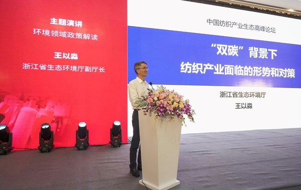 本届论坛以“助推产业赋能,引领绿色智造”为主题展开,旨在推动绍兴市纺织产业可持续发展。浙江省各级政府高度重视此次论坛的召开,希望借此机会汇聚业内各方专家学者和企业代表,共同进行深入交流,加快产业升级,打造高质量产业集群,同时探索绿色智造,实现可持续发展。值得一提的是,浙江省生态环境厅副厅长王以淼在峰会现场发表了题为《“双碳”背景下纺织产业面临的形势和对策》的主题演讲,从宏观的角度分享了国际“双碳”形势及纺织印染行业形势,并给出了生态环境领域政策的风向和对纺织产业的建议。