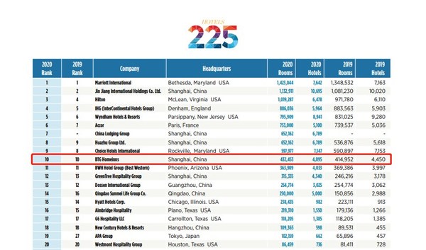 上海2021年8月4日 /新闻稿网 - Xinwengao.com/ — 近日,酒店业国际权威杂志《HOTELS》公布2020年度“全球酒店集团225强” (HOTELS 225)排名,首旅如家酒店集团凭借432,453间客房、4895家门店再次进入榜单前十。