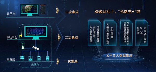 领充创新提出了三次集成技术,通过对设备层、监控层、云平台的三次集成管理,构建双碳下“光储充+”群的大数据云平台。在设备侧实现分组监控;在站控侧实现平台可视可控;在大数据云平台,实现跨区域数据集成、跨区域监控、跨区域高级管理,从而实现更高层面的能源调度和消纳。