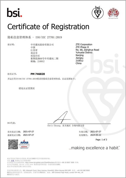 ISO/IEC 27701:2019是目前全球最具权威的隐私保护标准,该标准由国际标准组织(ISO)和国际电工委员会(IEC)于2019年8月联合发布,旨在帮助组织有效保护和合规处理所收集的个人信息,为企业满足《中华人民共和国网络安全法》、《欧洲通用数据保护条例》(GDPR)以及其他国家和地区的数据保护法律法规要求提供有力保障。经过全球权威认证机构BSI两个阶段的严格审核及全方位评估,中兴通讯在核心网产品的设计、开发、部署及运维等全流程隐私保护管理,均通过了符合国际标准的审核认证。