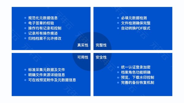 元年云电子档案解决方案全面保障“四性要求”,通过元数据检测、影像文件检测、预览水印、下载水印、下载控制、电子签章、日志管理等强大的系统控制逻辑,支持档案管理对真实性、完整性、可用性、安全性的“四性”检测要求。
