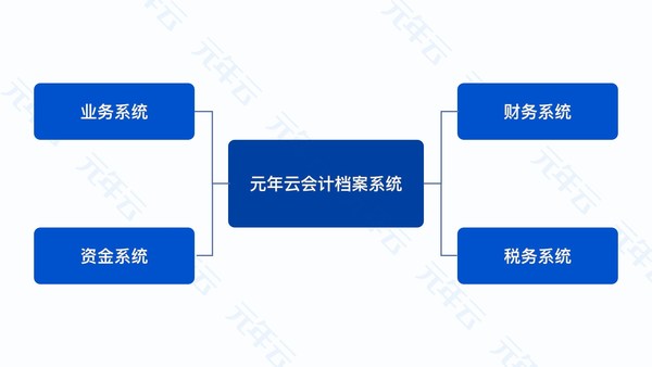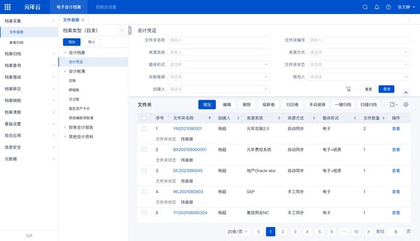 基于《会计档案管理办法》规定的业务系统的业务单据,财务系统的报销单据、原始凭证、记账凭证、账簿、资产卡片,资金系统的电子回单、余额调节表,税务系统的发票信息、纳税申报表,影像系统的各类影像单据等涉及的会计档案资料数据,采集到元年云电子档案系统中,建立关联,并且对会计资料分类存储、智能关联。