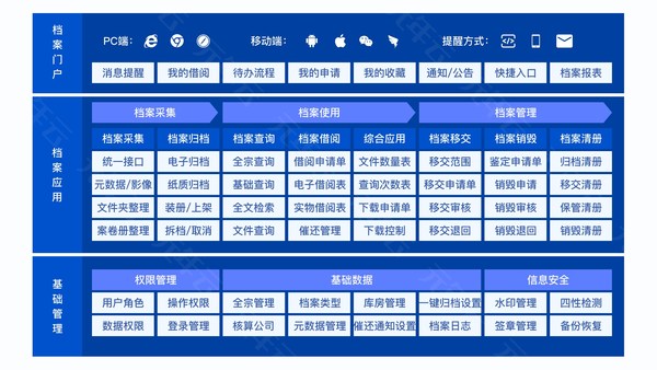 元年云电子会计档案系统,覆盖档案全生命周期,包括档案采集、归档、查询、借阅、应用、移交、销毁、清册等关键环节。