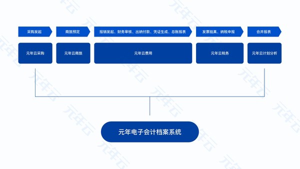 与元年云费用、采购、商旅、税务、计划分析等各产品线天然融合,自动完成从事前申请、采购处理、商旅预定、报销发起、发票验证、资金支付、凭证生成、总账报表、纳税申报、合并报表等会计资料自动归档。