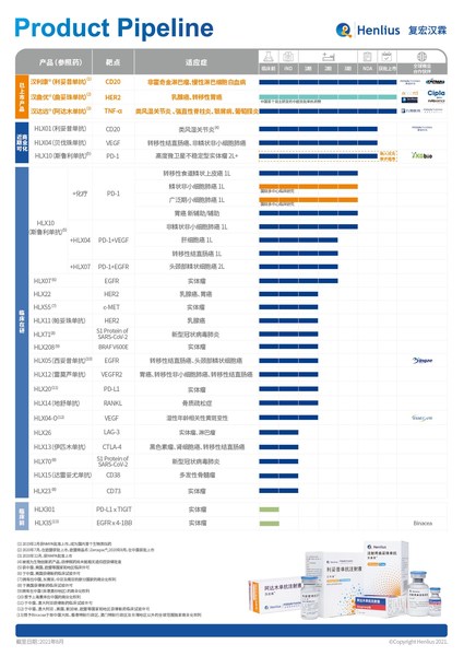 复宏汉霖前瞻性布局了一个多元化、高质量的产品管线,涵盖20多种创新单克隆抗体,并全面推进基于自有抗PD-1单抗斯鲁利单抗的肿瘤免疫联合疗法。继国内首个生物类似药汉利康®(利妥昔单抗)、中国首个自主研发的中欧双批单抗药物汉曲优®(曲妥珠单抗,欧盟商品名:Zercepac®)、公司首个自身免疫疾病治疗产品汉达远®(阿达木单抗)相继获批上市,创新产品斯鲁利单抗MSI-H实体瘤的上市注册申请已纳入优先审评审批程序,HLX04贝伐珠单抗及HLX01利妥昔单抗类风湿关节炎新适应症的上市注册申请也正在审评中。公司亦同步就11个产品、8个联合治疗方案在全球范围内开展20多项临床试验,对外授权全面覆盖欧美主流生物药市场和众多新兴市场。