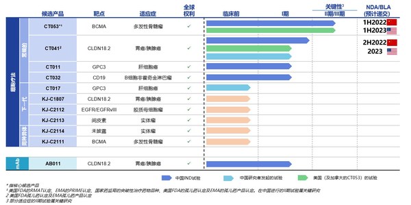 另一款CT041 为全球唯一靶向CLDN18.2的且已获得美国FDA和国家药监局的IND批准并正在进行临床试验研究的CAR-T候选产品,用于治疗胃癌和胰腺癌等实体瘤,已获得FDA及EMA孤儿药产品认定。有望实现CAR-T疗法在实体瘤治疗领域的突破。科济药业将于9月19日ESMO大会上对CT041 中国研究者发起试验(IIT)数据进展进行口头报告。此外,2021年上半年,科济药业已在中国向NMPA提交关键II期研究的咨询申请,并计划于2021年下半年启动关键II期临床试验,2022年下半年就先前至少接受两线系统治疗失败的胃癌患者的治疗提交NDA。在美国,公司计划于2022年对胃癌/ 食管胃结合部癌或胰腺癌患者进行关键的II期试验,2023年向美国FDA提交BLA。CT041已获得美国FDA授予“孤儿药”认定,用于治疗胃癌/胃食管结合部癌,并获得EMA授予“孤儿药产品”认定,用于治疗胃癌。