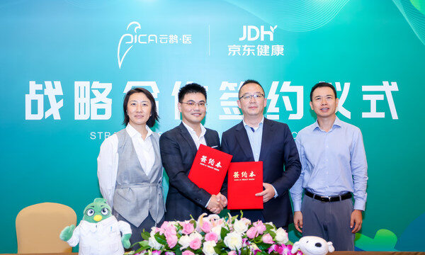 京东集团副总裁、京东健康药京采事业部总经理周新元(左三)与云鹊医CTO钱晋文(左二)代表合作双方签署合作协议,京东集团高级副总裁、京东健康CEO辛利军(右一)和云鹊医执行董事兼CEO刘娜(左一)共同见证。