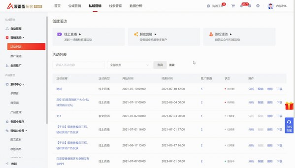 很多营销工具可以提供裂变活动。让用户分享海报,当足够多的人扫描海报上的二维码并且关注后,该用户就可以得到对应的奖励。这样便可以通过低价爆款的项目,驱动用户不断吸引更多的潜在客户。
