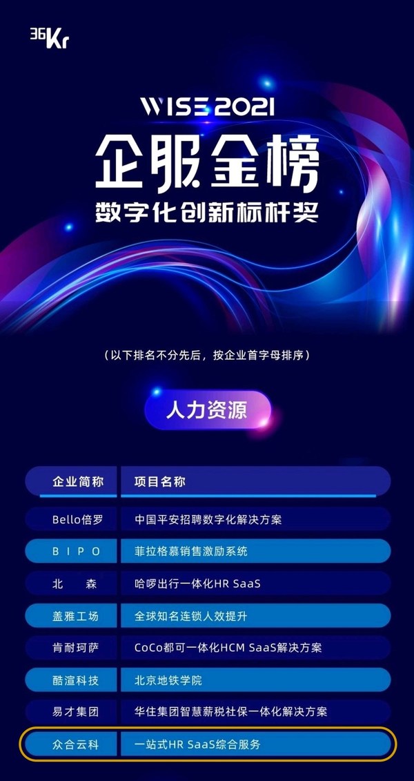 北京2021年9月3日 /新闻稿网 - Xinwengao.com/ — 9月2日,由36氪主办的“企业服务行业峰会”在上海隆重举行。活动现场,36氪正式公布“2021年WISE企服金榜”,众合云科作为国内领先的HR SaaS科技服务商,凭借着领先的技术优势以及创新的服务案例,继2020年入榜“中国新经济之王”后,再次荣登“36氪WISE企服金榜”并成功斩获“数字化创新标杆奖”。