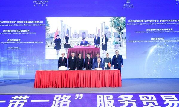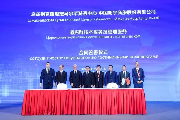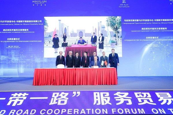 北京2021年9月4日 /新闻稿网 - Xinwengao.com/ — 在2021年中国国际服务贸易交易会“一带一路”服务贸易合作论坛上,中国领先的全服务酒店集团“明宇商旅”与乌兹别克斯坦国家重点工程“撒马尔罕游客中心”签署正式合同,明宇商旅将向撒马尔罕游客中心中的一家国际五星级标准的丝路明宇豪雅酒店,及一家国际四星级标准的兀鲁伯之星明宇丽雅酒店,提供全面的开发技术及管理服务。原外经贸部副部长龙永图、全国社保基金理事会原副理事长王忠民、乌兹别克斯坦共和国投资与对外贸易部驻华代表处主任伊斯穆哈美多夫·佐黑德先生、中国服务贸易协会会长周成虎院士、中国服贸贸易协会副会长兼秘书长仲泽宇先生共同见证了签约,撒马尔罕市市长博布尔米尔佐·奥布拉库洛夫专程视频致辞祝贺,明宇商旅董事长张建明先生与撒马尔罕游客中心全权业主代表贝佐德·阿利舍罗维奇.祖法罗夫先生代表各自企业进行了签约。
