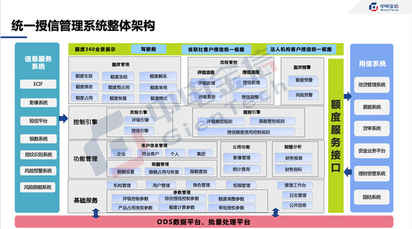 中电金信为江苏农信打造的统一授信管理系统,通过构建整个全场景,从客户的关联性的角度和从数据相关性的角度建立统一的授信管理体系。该系统实现了与信管系统、国结系统、票据系统、资金业务系统、理财资管系统、贷记卡审批系统等业务系统的数据交互,实时获取贷款、票据承兑和贴现、担保等授信生成、占用及释放等数据信息,全面有效的监测所有授信业务信息。通过对同一客户(个人客户、法人客户、集团客户、同业客户)的统一授信管理额度管理,并与风险预警系统、风险限额偏好管理系统等内部系统以及征信、大数据平台等外部系统的对接,实现对授信相关风险的提示和拦截,帮助银行防范风险。