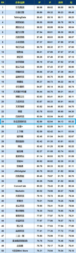 深圳2021年9月10日 /新闻稿网 - Xinwengao.com/ — 9月2日,德本咨询联合中科院旗下的eNet研究院和《互联网周刊》发布2021智能营销创新TOP50排行榜。东信营销科技(以下简称“东信”)入选该榜单并获得第24位的排名。2021智能营销创新TOP50排行榜由主办方从参选企业行业地位、现代科技创新实力、品牌影响力等多维度实力的综合评估而得出,严谨的评选流程与标准给榜单增加了权威性、公正性。
