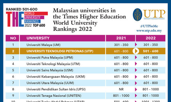 马来西亚斯里依斯干达2021年9月13日 /新闻稿网 - Xinwengao.com/ — 2022年泰晤士高等教育 (THE) 世界大学排名显示,国油科技大学(Universiti Teknologi PETRONAS,简称“UTP”)在马来西亚私立大学中排名第一,并且成功跻身成为所有马来西亚大学的第二名。在最新的排名中,国油科技大学在论文引用、研究和国际化前景三个指标方面的得分都有所提高。