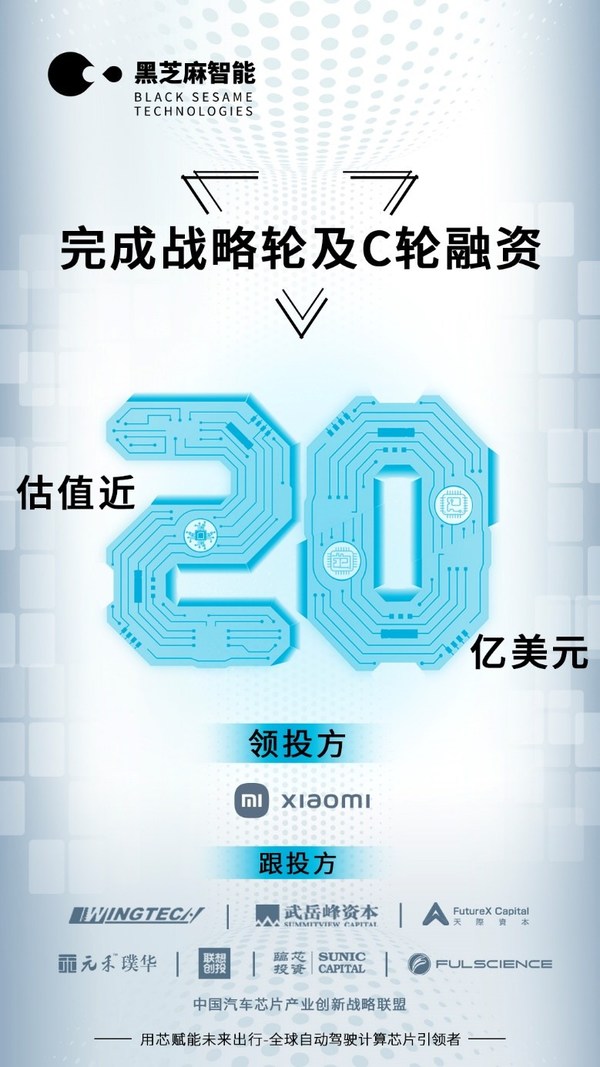 上海2021年9月22日 /新闻稿网 - Xinwengao.com/ — 9月22日,全球自动驾驶计算芯片引领者黑芝麻智能宣布今年已经完成数亿美元的战略轮及C轮两轮融资。战略轮由小米长江产业基金,富赛汽车等国内产业龙头企业参与投资;C轮融资由小米长江产业基金领投,闻泰战投、武岳峰资本、天际资本、元禾璞华、联想创投、临芯资本、中国汽车芯片产业创新战略联盟等跟投。战略轮及C轮融资投后估值近20亿美元,黑芝麻智能正式步入超级独角兽行列。目前C+轮融资也在顺利推进中。