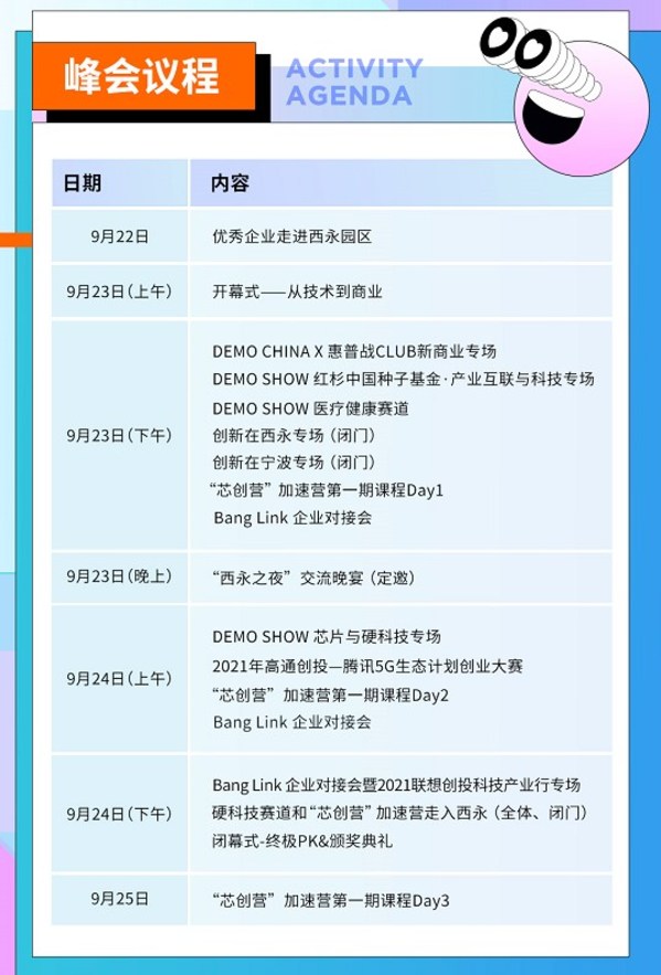 重庆2021年9月23日 /新闻稿网 - Xinwengao.com/ — 为挖掘创新力量,促进科创企业成长。创业邦携手众多产业代表性力量共同打造的2021 DEMO CHINA创新中国峰会将于9月23-24日在重庆融创国际会议中心拉开帷幕。 峰会整体议程 01“从技术到商业”DEMO CHINA亮点众多 本次峰会将以“从技术到商业”为主题,邀请地方政府领导、多位产业专家、知名投资人以演讲、专场对话等形式带来最新的行业洞察,来自全国的优秀创业企业也将在DEMO SHOW登台展示项目。 此外,峰会现场还将发布《2021年度中国最受赞赏的创业投资机构》《2021年度中国最受赞赏的早期投资机构》榜单。创业邦与重庆本地产业园区联合举办的“芯创营”也将在现场揭幕。 在演讲、论坛和DEMO SHOW之外,本届DEMO CHINA首次推出全新环节 — Bang Link企业对接会。中国移动、施耐德电气、博世、南网科技、宝马(中国)、CJ集团(中国)、上海电气、罗技(中国)、村田制作所、圣戈班集团、旭化成杭州有限公司、柯尼卡美能达、广联达、中国金茂、赢创等二十多家国内外知名大企业释放场景业务需求。 峰会现场,200余家一线投资机构、1000位投资人、500+创新项目齐聚现场现场,双方当面交流,对接业务、融资需求,让与会者在交流中激发更多合作机会。 02五大专场论道比拼捕捉闪闪发光的创新者 热点每年刷新,但不变的是产业持续迭代的步伐。每一年DEMO CHINA都会从最新的技术趋势、产业政策、创投风向切入,设置议题、邀请嘉宾、招募创业者,逐步深入到产业的微观场景与底层逻辑。 本届DEMO CHINA,创业邦与高通创投、腾讯5G生态计划、惠普、红衫种子基金、H50(中国医疗健康产业投资50人论坛)、重庆西永园区等合作伙伴共同打造的5G生态、消费新商业、产业互联与科技、医疗健康、芯片与硬科技五大专场将于9月23-24日逐一开启。 多位嘉宾深入垂直赛道,以演讲、对话等形式,讨论垂直赛道议题,展示并分享5大领域的技术、创投动向。 数字化在以什么方式驱动时代?消费市场的下一个变量在哪?赋能后的医疗健康龙头长什么样?5G生态还有多远的路要走?如何抓住硬科技窗口期?所有跟垂直赛道专场相关的内容,都能从专场对话中探知一二。 03多方协力打造精彩DEMO SHOW 从23日下午到24日上午,由行业知名投资人、合伙人及优秀企业家共同打造的5场精彩Demo Show轮番上演。50+经过层层筛选的创业者面向全国一线投资人展示其项目的技术优势、商业模式。值得一提的是,此次成功拿到DEMO SHOW晋级门票的50+创业项目中,深光科技、秒可职场、三餐有料、重力聿画、悠潭、流马锐驰、UGOHOUS、晶准生物等32个创业项目孵化自创业邦星际营。自2015年创办以来,创业邦星际营受到2w+创业者的青睐,截至2020年底,已成功开办20期,共821个创业项目入选加速,共帮助406家学员企业获得融资72亿。如今多个项目突出重围入选DEMO SHOW,也是给信任创业邦、信任星际学院的创业者们交上了一份完美的答卷。 DEMO SHOW共分两场,每场前2名晋级,在24日下午闭幕式的终极PK环节争夺DEMO GOD桂冠。 终极PK环节,由腾讯投资管理合伙人、腾讯集团副总裁李朝晖,DCM中国创始合伙人、董事合伙人林欣禾,愉悦资本创始及执行合伙人刘二海,高通全球副总裁兼高铁创投董事总经理沈劲,嘉御基金创始合伙人兼董事长卫哲,红点创投中国基金创始及主管合伙人袁文达,火山石资本创始合伙人章苏阳,金沙江创投主管合伙人朱啸虎等投资大咖组成的专业导师评审团进行总结和分享,最终综合评定给出成绩。 经过DEMO CHINA舞台的放大,相信不少优秀创业者将得到投资机构赏识、商业化道路更顺畅。 2021 DEMO CHINA创新中国峰会,在讨论前沿产业、高效链接产业资源的同时,更为大企业、投资机构、创业者提供一个分享、交流的机遇和窗口。 更多精彩,尽在9月23至24日重庆融创国际会议中心,期待观众莅临。