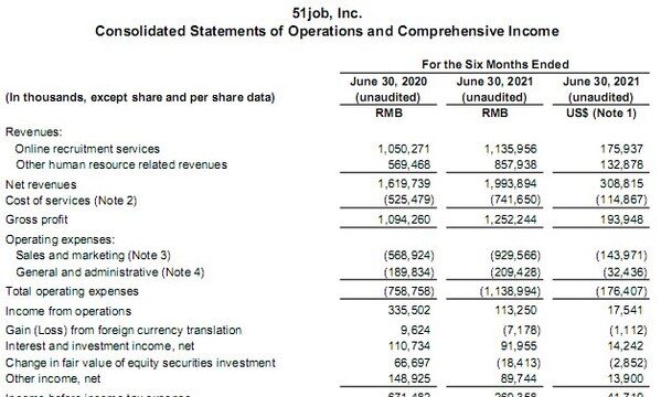 上海2021年9月24日 /新闻稿网 - Xinwengao.com/ — 前程无忧(Nasdaq:JOBS)今天发布其未经审计截至2021年6月30日的2021年第二季度财务业绩。第二季度净收入增长32.6%至10.9870亿元(1.702亿美元),在线招聘服务收入增长17.4%,其他人力资源相关收入增长56.2%。