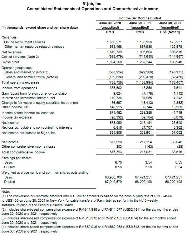 - 不计入股权奖励支出、汇兑损益、上市股票证券投资的公允价值变动以及与这些项目相关的税收影响,前程无忧第二季度调整后每股普通股完全摊薄收益(不按照美国通用会计准则)为人民币3.64元(0.56美元)。