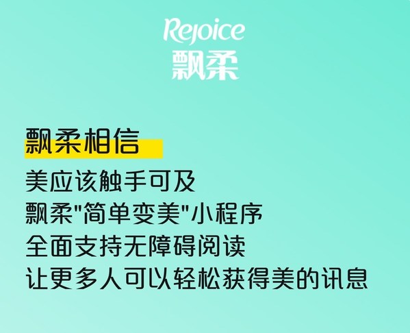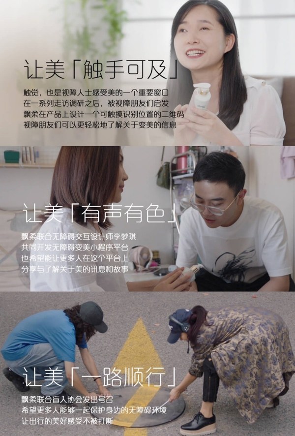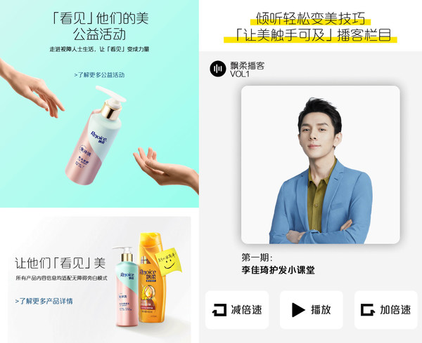 飘柔一直以来热心公益事业,此次“让美触手可及”公益活动更是,为视障人群带来了简单变美的机会。由于视障朋友感受美的途径大多是通过声音,触觉,但产品上的信息,经常无法读取。因此,飘柔在23日晚李佳琦直播间亮相了“会说话的护发素”和“简单变美”微信小程序。