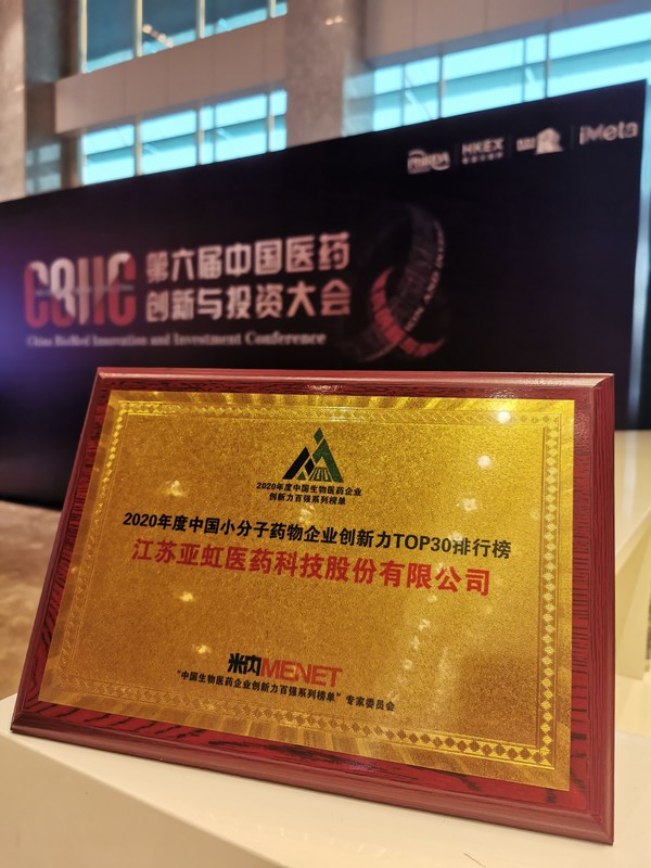 上海2021年9月27日 /新闻稿网 - Xinwengao.com/ — 亚虹医药近日宣布入选由米内网主办的苏州“2020年度中国生物医药企业创新力百强系列榜单”发布会上公布的“2020中国小分子药物企业创新力TOP30”榜单。亚虹医药作为国内专注于泌尿生殖系统肿瘤及其它重大疾病领域的全球化创新药公司冲入榜单30强,并受邀参加颁奖典礼。