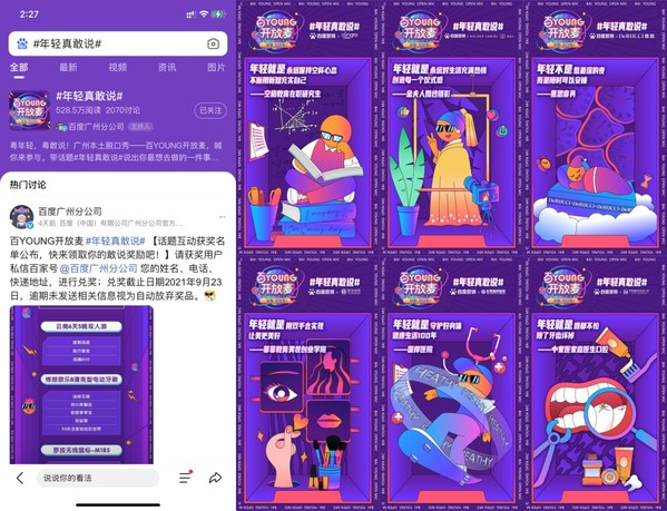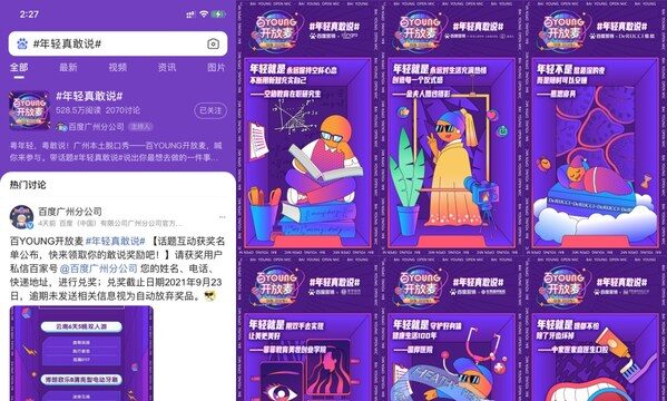 截至目前,百YOUNG开放麦#年轻真敢说#的话题在全网曝光量已经超过了600万次,讨论量超过2000次。