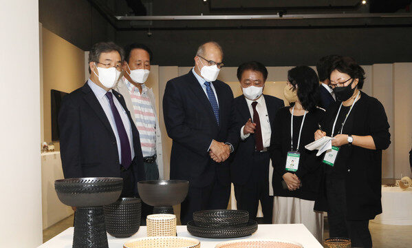 ‘Pillippe Leport’ French ambassador to Korea and ‘HAN Beum-Deuk’ Cheongju Mayor are touring the exhibition of the Invited Country Exhibition ‘Objet-Tableau;Matieres de France’. (French ambassador to Korea is third from the left.)