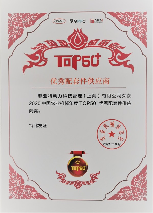本次2020年中国农业机械年度TOP50+颁奖盛典以“推陈塑新,铸造王者”为主题,分别从年度产品类、年度品牌类等多个维度,颁发出多项重量级大奖。会上,菲亚特动力科技再获2020中国农业机械TOP50+年度优秀配套件供应商奖,彰显了其在农业机械用发动机的技术实力。