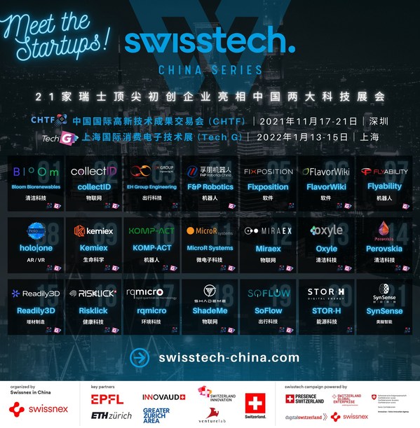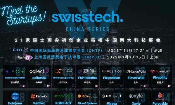 上海2021年10月14日 /新闻稿网 - Xinwengao.com/ — SwissTech瑞士展馆将携21家顶尖瑞士初创企业在2021年11月17日至21日于深圳举行的中国国际高新技术成果交易会(CHTF)和2022年1月13日至15日于上海举行的上海国际消费电子技术展(Tech G)上登台亮相。21家瑞士初创企业中包括来自Venturelab组织的2021 Venture Leaders 深科技创业计划的七家瑞士深科技初创企业。