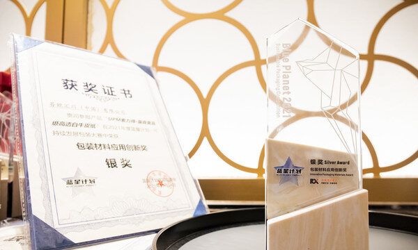 近年来,随着人们环保意识的提升,“以纸代塑”已经成为一场全球性的绿色风潮,可持续包装变革势在必行。作为包装行业的年度盛会之一,本届IPIF国际包装创新大会聚焦可持续包装展开了多场圆桌论坛和主题演讲,通过国内外优秀案例分享,全面洞悉未来包装新风向。大会期间,UPM特种纸纸业亚太区业务发展总监夏晓辉先生受邀出席餐饮外卖分论坛圆桌讨论,就“构建餐饮新常态”话题向与会同行分享了UPM在食品包装领域的最新尝试。除此之外,本次大会还举办了2021年度蓝星计划颁奖仪式。作为全球领先的森林工业企业之一,芬欧汇川UPM(以下简称“UPM”)携旗下全系列产品亮相本次大会,其中索力得·露森食品级高透白牛皮纸凭借“减塑、减量”的优异环保效果,以及“高紧度、高光泽度、高平滑度”的出色性能和印刷效果荣获包装材料应用创新奖银奖。
