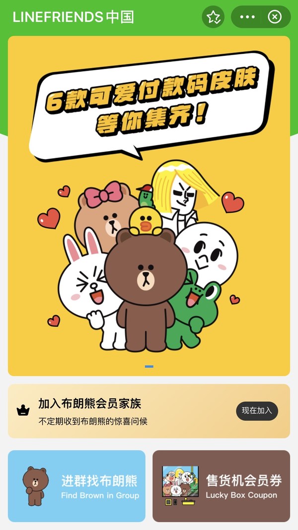 上海2021年10月19日 /新闻稿网 - Xinwengao.com/ — 萌翻全球的国际创意工作室LINE FRIENDS日前正式入驻支付宝小程序,开启与支付宝的长期合作,以“支付宝上新”作为营销承接,布朗熊也为粉丝们带来了一系列的惊喜,除了作为生活号平台搭建私域社群与粉丝近距离互动沟通之外,还可以通过LINE FRIENDS支付宝小程序搜索附近的LINE FRIENDS LUCKY BOX线下无人售货机,小程序内也可以领取售货机的会员卡券在线下进行兑换核销,除此之外,更有6款萌趣精美的支付宝付款码皮肤于10月14日和11月18日陆续惊喜上线,给消费者带来更多萌趣的体验。 LINE FRIENDS 支付宝小程序页面 LINE FRIENDS 支付宝小程序页面 LINE FRIENDS支付宝小程序于10月14日 – 10月17日期间率先推出两款支付宝付款码皮肤:通过支付宝上新IP实现“0号位”到小程序的公私域联动。以布朗熊和可妮兔为经典人物形象的BROWN & FRIENDS 10周年为契机,10周年款皮肤囊括了BROWN & FRIENDS的11位萌趣人物,火热的庆祝气氛溢满屏幕;而星星款皮肤则让布朗熊、可妮兔和莎莉三位人气王脚踏天梯手摘星辰,探索无尽未知的神秘夜空。10周年款皮肤通过会员频道会员积分兑换、星星款皮肤将通过私域社群任务领取。截至10月17日,两款付款码皮肤的领取总量高达53万多。目前LINE FRIENDS支付宝小程序共建私域社群383个,汇集群粉丝约18万人,打破支付宝社群运营单日最快记录,开启LINE FRIENDS中国地区粉丝运营的新机会,未来LINE FRIENDS将在支付宝平台开启系列的粉丝运营新动作,并更多地打开支付宝粉丝运营的想象空间。另有4款LINE FRIENDS支付宝付款码皮肤将于11月18日上线。 LINE FRIENDS 支付宝付款码皮肤 LINE FRIENDS 支付宝付款码皮肤 早在LINE FRIENDS 2021授权商大会上,LINE FRIENDS CEO James便表示,LINE FRIENDS正全面开展数字化战略布局,从传统的线上线下零售公司,发展为与时俱进的数字娱乐IP公司,致力于打造符合元宇宙世代、以提供数字化和新体验服务为中心的空间。除了发展以内容为核心的数字资产、以短视频为起点打造中国市场内容中心、开发新的数字化IP业态、上线消费者线上DIY定制平台,此番与支付宝的合作也印证了LINE FRIENDS数字化转型的决心。