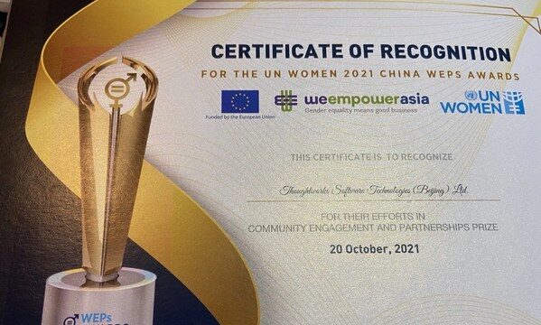 思特沃克(Thoughtworks)由于在推进女性社区领域的积极贡献和突出成就,被授予“社区参与和伙伴关系类别奖”。这是思特沃克继2020年荣获“中国区Leadership Commitment-领导层承诺奖”之后,再度荣膺WEPs(即“赋权予妇女原则”)奖项。同期获奖的企业还有普华永道、携程集团、诺亚控股等。