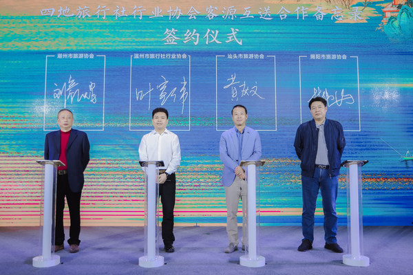 活动现场,温州市、汕头市、潮州市、揭阳市等四地旅行社行业协会签署了“四地旅行社行业协会客源互送合作备忘录”。温州市文广旅局朱云华、汕头市文广旅局局长陈泳双及潮州文广旅局负责人等领导开启了“百万广东人游温州启动仪式”。