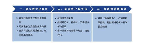 对B2C企业而言,进行营销数字化升级需经历以下三个阶段:建立数字化触点、实现客户数字话和打通营销数据链,每一阶段企业发力方向都有所差异。