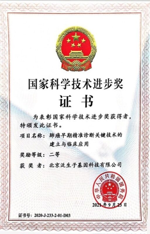 北京2021年11月3日 /新闻稿网 - Xinwengao.com/ — 今日,泛生子(纳斯达克代码:GTH)与四川大学华西医院深度合作的“肺癌早期精准诊断关键技术的建立与临床应用”项目,获得了2020年度国家科技进步二等奖,泛生子也因此成为今年唯一癌症精准医疗获奖企业。 该项目由四川大学华西医院李为民教授牵头,泛生子团队深度参与,揭示了年轻非吸烟肺癌独特的分子基因特征,建立了我国40岁以上高危人群低剂量螺旋CT筛查肺癌的新技术,破解了早期肺癌漏诊的难题;建立影像组学肺癌预测模型,研发中国领先的智能肺癌病种库及肺癌(肺结节)人工智能辅助诊断系统,突破了肺癌早期精准诊断技术难题;通过多组学特征解析肺癌演化分子机制,确定了高准确率肺癌早期诊断分子标志物,解决了肺癌早期分子分型靶向治疗的瓶颈问题。 针对早期肺癌精准诊疗难的课题,项目组以泛生子自主研发的专利技术“一步法快速构建扩增子文库的方法”(中国发明专利 ZL201710218529.4,以下简称“一步法”)为核心,构建了早期肺癌微量样本的分子检测新方法,在准确性、可及性等多个指标上超越了目前国际主流技术,成为新一代高通量分子检测技术的标杆。 项目资料显示,在准确性方面,泛生子的“一步法”专利技术在10ngDNA起始量水平,对于3%的突变检测准确率为100%;在30ngRNA起始量水平,对于100个变异拷贝数的融合检测准确率为100%,可满足早期肺癌微量样本检测。 在可及性 — 易用性、经济成本层面,采用“一步法”技术能够避免多次开盖操作,防止潜在污染的发生,同时将建库时间从传统的1-2天缩短到仅1.5小时,其中人工操作仅5分钟,收到样本后最快2天即可出具检测报告,降低了对于实验人员的能力需求,更将测序成本大幅降低。 人类8基因突变联合检测试剂盒(半导体测序法)(国械注准20203400072) 在本项目中,搭载了“一步法”的泛生子“人类8基因突变联合检测试剂盒(半导体测序法)(国械注准20203400072)”发挥了巨大作用,该试剂盒可一次性检测与非小细胞肺癌患者靶向治疗密切相关的8个基因突变和融合,为患者提供用药指导、分子分型、预后评估等一系列服务;此外,泛生子还配套开发了对应的高通量基因测序仪Genetron S5(国械注准20193220820)和全自动加样系统GENETRON Chef,以及配套的自动化分析系统。完整的检测设备和系统覆盖了基因检测全过程,大大降低临床使用的技术门槛,可满足各级医院基层实验室检测需求、并解决缺少专业分析人员的问题。 泛生子联合创始人及首席执行官王思振表示:“非常自豪,泛生子的原研技术及产品,能够助力临床创新,并获得国家级奖项认可。相信未来,我们围绕癌症全周期诊疗进行的技术探索,会随着产品的大规模应用,真正改变人们的健康管理方式。” 关于国家科学技术进步奖 国家科学技术进步奖,是国务院设立的国家科学技术奖5大奖项(国家最高科学技术奖、国家自然科学奖、国家技术发明奖、国家科学技术进步奖、国际科学技术合作奖)之一。 国家科学技术进步奖主要授予在技术研究、技术开发、技术创新、推广应用先进科学技术成果、促进高新技术产业化,以及完成重大科学技术工程、计划等过程中做出创造性贡献的中国公民和组织。 关于泛生子 泛生子(纳斯达克代码:GTH)是全球前沿的癌症精准医疗公司,专注于癌症基因组学研究和应用,并致力依托先进的分子生物学及大数据分析能力改变癌症诊疗方式。泛生子已打造了全面的产品及服务管线,覆盖从癌症早筛到诊断及治疗建议,再到监测及预后管理的癌症全周期,并与产业链上下游合作伙伴积极拓展分子检测技术的更多创新应用方向和场景。更多公司信息请访问:https://www.genetronhealth.com。 安全港声明 本新闻稿包含泛生子对未来的预期、计划和前瞻性陈述,具有相应风险及不确定性,可能导致实际结果与前瞻性陈述中描述的预期不符。此类陈述是根据1995年美国私有证券诉讼改革法案的“安全港”条款作出的。前瞻性陈述涉及固有风险、不确定性,以及许多可能导致实际结果与任何前瞻性陈述中所描述的内容产生重大差异的因素。其它包含有“预期”、“相信”、“期待”、“计划”等措辞和类似表达也属于前瞻性描述。更多有关这些内容及其他风险、不确定性因素的信息,已包含在公司向美国证券交易委员会提交的备案文件中。本新闻稿中提供的所有信息不应被视为本公告发布之日后任何时点的观点。泛生子预计未来的事件和进展会导致公司的设想和假设发生变化,但无论是否出现了新的信息、未来事件或其它情况,除适用法律要求外,公司不承担更新任何前瞻性描述的义务。
