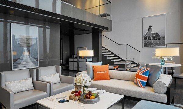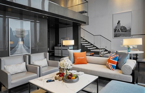 位于61层的天际套房,复式设计且层高超过6米,同时拥有叹为观止的山城景致及绚烂缤纷的江河夜景,客房内淡雅大地色系色调,结合顶尖设计师的时尚灵感,同时还搭配有迈凯伦品牌的软装饰品,为宾客营造低调奢华,精致静谧的入住体验,让客人感受到大都市的潮流风尚,奢华的舒适享受,两个品牌的理念与精神在此次联名合作中相得益彰。联名主题天际套房价格为人民币10,520元/晚,入住宾客可尊享以下多重礼遇。