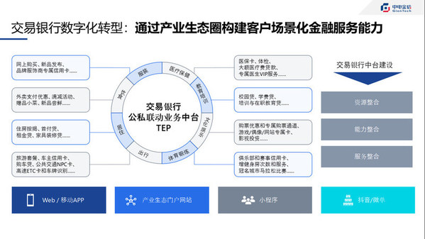 在交易银行建设发展策略方面,中电金信强调各项业务针对“场景”的适配和整合。以“搭平台、接客户、跨商务、积数据、建生态、促转型”为主题,围绕构建“金融+商流+数据”商业生态体系为中心,协助银行将现有渠道、产品、服务进行逻辑整合,打通系统之间的数据壁垒和流程牵制,通过场景建设、场景嵌入、场景输出等方式形成与企业经营行为的连接,将金融业务精准的嵌入到每一个交易场景,最终形成业务流、信息流、资金流、物流一体化的交易银行生态平台。