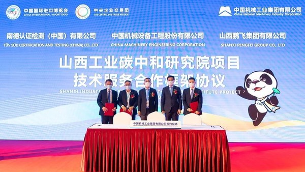 上海2021年11月6日 /新闻稿网 - Xinwengao.com/ — TUV南德意志集团(以下简称“TUV南德”)携手中国机械设备工程股份有限公司(简称“CMEC”),与山西鹏飞集团有限公司(“鹏飞集团”)于2021年第四届中国国际进口博览会(以下简称“2021 进博会”)签署战略合作框架协议。合作内容主要围绕煤、焦、化、氢、电、运等行业的节能减排、绿色低碳、转型发展等内容进行知识服务及技术合作,共同打造山西工业碳中和研究院。在化工,碳中和共享平台、煤矿智能化改造,充分发各方优势,进行产业布局、碳中和管理、节能增效、技术评估、安全风险管理等方面的积极合作,以带动产业族群实现科学布局和有序发展,实现充满希望的清洁的未来。CMEC 集团副总经理丁宏祥、TUV南德北亚区首席财务长李仲衡、TUV南德大中华区工业服务部高级经理王军、市场开发经理王敏出席并见证此次颁证仪式。 TUV南德北亚区首席财务长李仲衡先生与CMEC国内业务事业部总经理张鹏、鹏飞集团总裁助理马小龙共同签署合作框架协议 “双碳”目标作为全球性课题而备受各国关注。在上月国务院官网发布的《国务院关于印发2030年前碳达峰行动方案的通知》中也提出到2030年,非化石能源消费比重达到25%左右等要求。针对传统化石能源如何进行节能减排及转型,成为了众多企业关注的话题。 CMEC与TUV南德合作多年,双方在欧洲、印度、土耳其等地开展多次出口认证合作,此次双方的合作将围绕多个行业的节能减排、绿色低碳、转型发展等内容进行知识服务及技术合作。该协议的签署也将把CMEC与TUV南德在国际合作的经验引入国内,对CMEC深入开展碳达峰、碳中和,煤化工及氢能产业领域的项目开发,引领“双碳”行业发展,延展产业链条方面发挥重要作用。 CMEC集团副总经理丁宏祥对TUV南德的认证服务给予了充分的肯定,并表示:“在我国‘3060’的愿景下,CMEC融入国家能源变革中,充分认识到煤化工和电气化在能源系统脱碳中发挥关键的作用,CMEC与TUV南德今后也将在煤化工基地设备安全、智能管理、碳中和等领域更加广泛和深入的合作。” TUV南德北亚区首席财务长李仲衡说道:“TUV南德作为一家全球领先的第三方检测认证机构,依托自身150多年经验积累以及全球化工、碳排放和氢能安全成果,结合工业4.0与新技术下法规监管经验在此次合作中发挥力量,为CMEC面向未来的可持续发展贡献力量。”