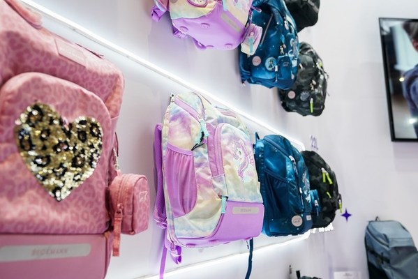 根据孩子们的审美诉求,Beckmann贝克曼现场还带来一系列原创设计、充满北欧美学的高颜值书包系列,如“彩虹独角兽”书包充满了北欧仙境式的童话气息,“蓝色宇宙”书包令人漫游在无边宇宙的浪漫之中,还有“机械龙”、“变形金刚”等,深受大小儿童喜爱。粉、蓝、紫、青……低饱和度莫兰迪色系的各款书包依次渐变排列在展架上,令人身处舒适愉悦的设计感空间。