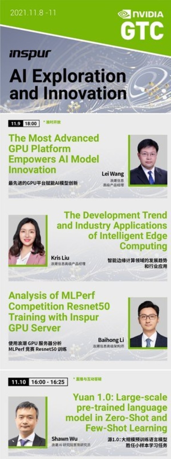 作为大会钻石赞助合作伙伴,浪潮信息将在GTC大会上带来四场主题演讲,分享在大规模预训练语言模型、AI加速计算以及智能边缘计算等领域的最新洞察和前沿成果。