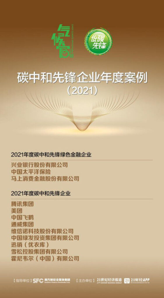 同时,碳中和先锋企业年度案例(2021)发布,兴业银行股份有限公司、中国太平洋保险和马上消费金融股份有限公司三家企业获选“2021年度碳中和先锋绿色金融企业”年度案例,腾讯集团、美团、中国飞鹤、通威集团、维信诺科技股份有限公司、中国绿发投资集团有限公司、迅销(优衣库)、雪松控股集团有限公司、霍尼韦尔(中国)有限公司共九家企业获选“2021年度碳中和先锋企业”年度案例。