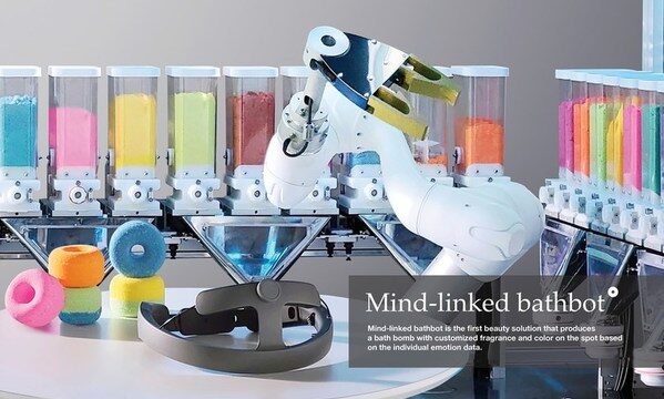 “Mind-linked Bathbot”能通过脑电波来分析人的情绪,并由机器人当场制作出拥有反映该情绪的香气和颜色的入浴剂。用户戴上搭载8个传感器的头戴式设备后,该设备将实时检测用户的脑电波,分析相应数据后为用户找到最适合的个人香气和颜色,然后再由机器人根据这些信息现场制作出定制型沐浴膏(入浴剂),制作过程仅需1分钟。“Mind-linked Bathbot”部分服务已在今年5月和6月在Amore Store光教店和汝矣岛现代百货店与广大顾客见面。