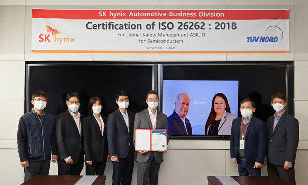 韩国首尔2021年11月12日 /新闻稿网 - Xinwengao.com/ — SK海力士于11月12日表示,针对车用存储半导体公司成功获取了功能安全国际标准ISO 26262:2018 FSM(功能安全管理,Functional Safety Management)标准认证。负责此次认证的机构是德国的全球权威汽车功能安全认证机构TUV Nord,随后双方举行了线上认证授予仪式。出席授予仪式的有沈大用SK海力士汽车业务担当副社长、宋埈豪SK海力士品质系统担当副社长、TUV Nord认证机构长Bianca Pfuff和首席审查官Josef Neumann。