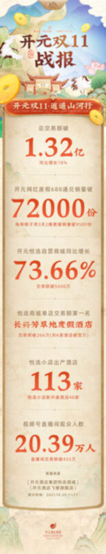 以开元酒店集团为例,在“第二竞技场”的数据十分亮眼。截至11月11日24点,开元酒店全渠道订单量超19万份,交易额超1.32亿元。其中开元酒店集团官网主站、官方直播以及社群推广平台订单量超9.2万份,交易额超5658万元,创下历史新高。