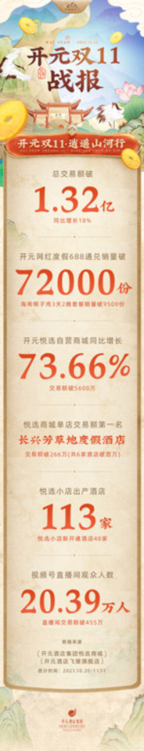 此外,截至11月11日24点,开元酒店集团在飞猪渠道总订单量超9.9万份,交易额超7567万元。其中借助飞猪会场资源位及外部合作推广王牌网红度假688通兑订单量超4.6万份,交易额超3800万元,单店客房产品产量更是超1900万元。
