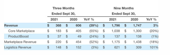 北京2021年11月12日 /新闻稿网 - Xinwengao.com/ — 北京时间11月11日,全球领先的移动电子商务平台Wish母公司ContextLogic公布了第三季度财报。截至2021年9月30日,Wish第三季度总收入3.68亿美元,较去年同期6.06亿美元减少39%;2021年前三季度总收入17.96亿美元,同比增长3%。