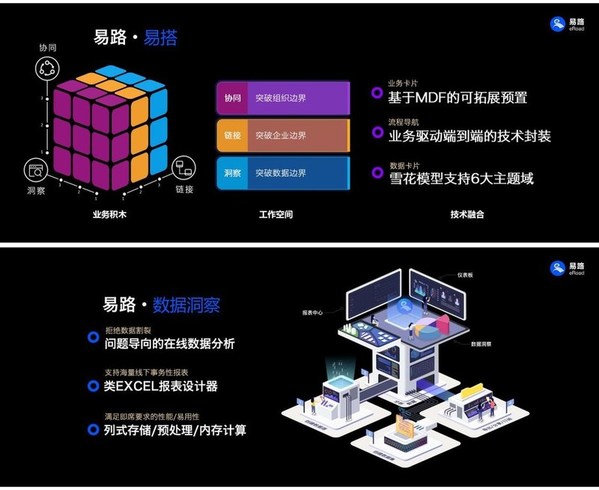 承接这些数字化场景,帮助企业与员工实现因人而易的变化,需要的是拥有行业的最佳实践,具备先进的产品理念与技术支撑,易路首席技术官陆玮先生在本次峰会上发布了两款产品:易搭和数据洞察(D-Insight)。