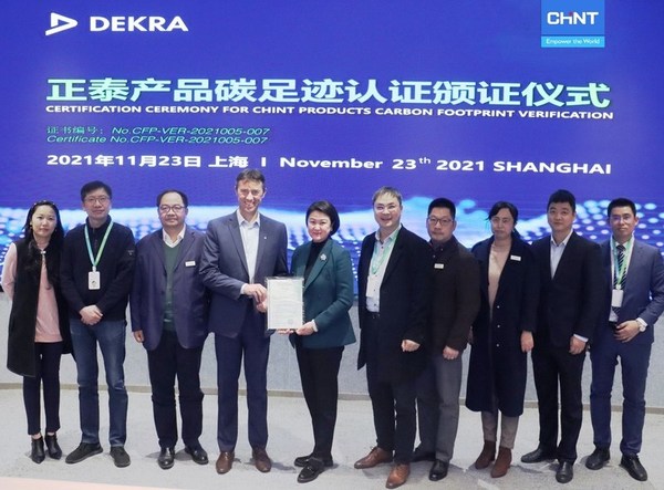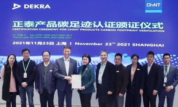 上海2021年11月24日 /新闻稿网 - Xinwengao.com/ — 2021年11月23日,正泰荣获DEKRA德凯颁发的中国首张低压电器领域碳足迹认证证书。此次颁证仪式在上海隆重举行,正泰电器董事、副总裁、正泰国际总裁张智寰女士,DEKRA德凯亚太区高级副总裁Gerhard Lübken先生,以及DEKRA德凯中国认证与业务保障总经理韦斌生先生共同出席了本次颁证仪式。
