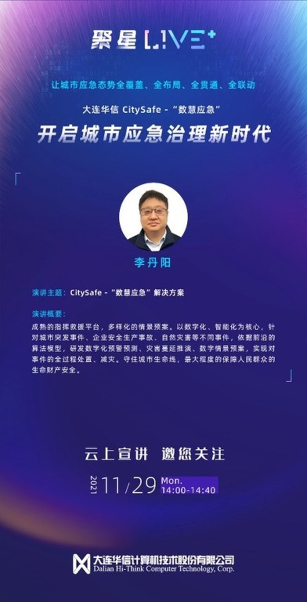 大连2021年11月29日 /新闻稿网 - Xinwengao.com/ — 为帮助各级应急管理部门,提升应急管理能力,满足新时代应急管理工作需要,11月29日14:00~14:40,大连华信将举办CitySafe -“数慧应急”解决方案发布会。