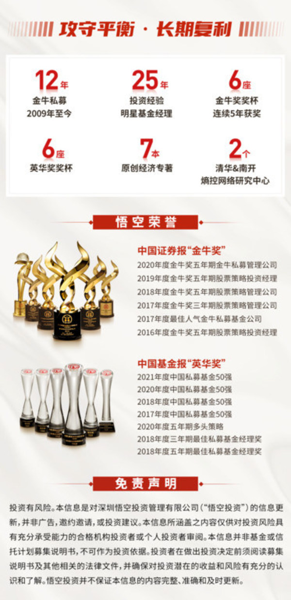 今日2021英华奖榜单公布,悟空投资第四次荣获中国私募基金50强大奖,累计七座英华奖