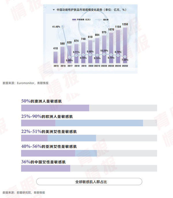 其中,敏感肌护肤品的市场增长较为强劲。报告指出,敏感性皮肤在世界各国均有较高的发生率,中国敏感肌女性占比则达到36%。敏感肌人群增多,肌肤修护呈高诉求,皮肤敏感是消费者最想改善的第二大肌肤问题。