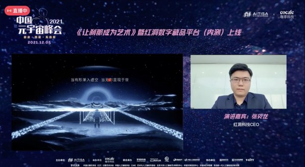 区块链独角兽企业【趣链科技】控股子公司【红洞科技】CEO张贝龙发表了题为“让刹那成为艺术”的主题演讲,分享了关于数字藏品与元宇宙的思考:“一个全新的世界需要空间与时间,显像技术和沉浸式体验技术创造了身临其境的数字空间,而区块链技术通过‘块’与‘链’的组合,利用数字藏品记录数字世界中的时刻,创造了属于元宇宙的数字时间,最终通过时空的融合,元宇宙诞生了。”随后,张贝龙先生也阐述了红洞科技的品牌内涵,红洞品牌象征着红洞志在荟聚天地万物,做文化创意产业链供需方间的连接器。
